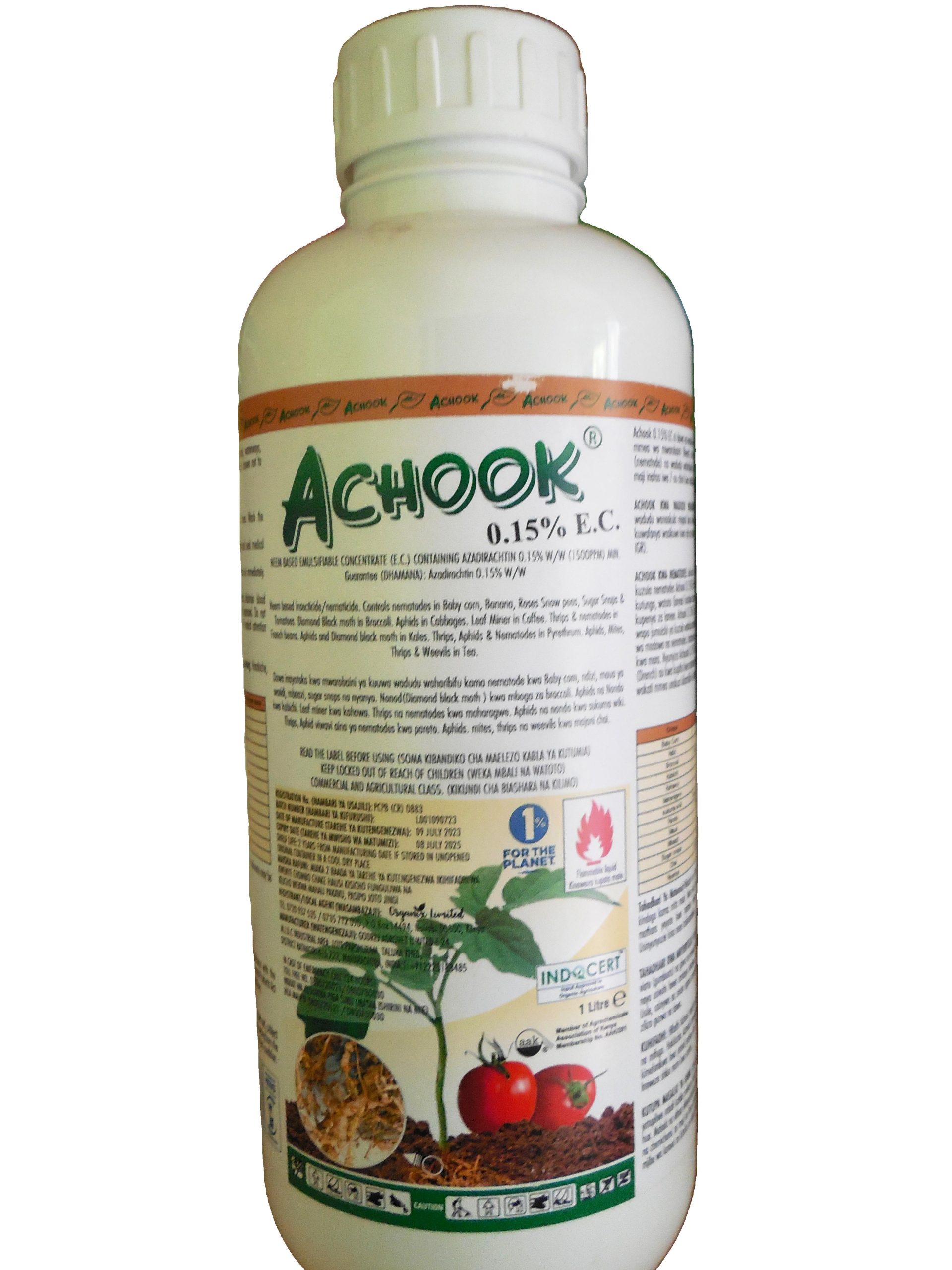 Achook, neem based emulsifiable concentrate controls nematodes, diamond black moth, aphids, thrips, weevils, whiteflies and other crop pests. Achook controls foliar pests by the action of antifeedant, repellant, insect growth disruptor.