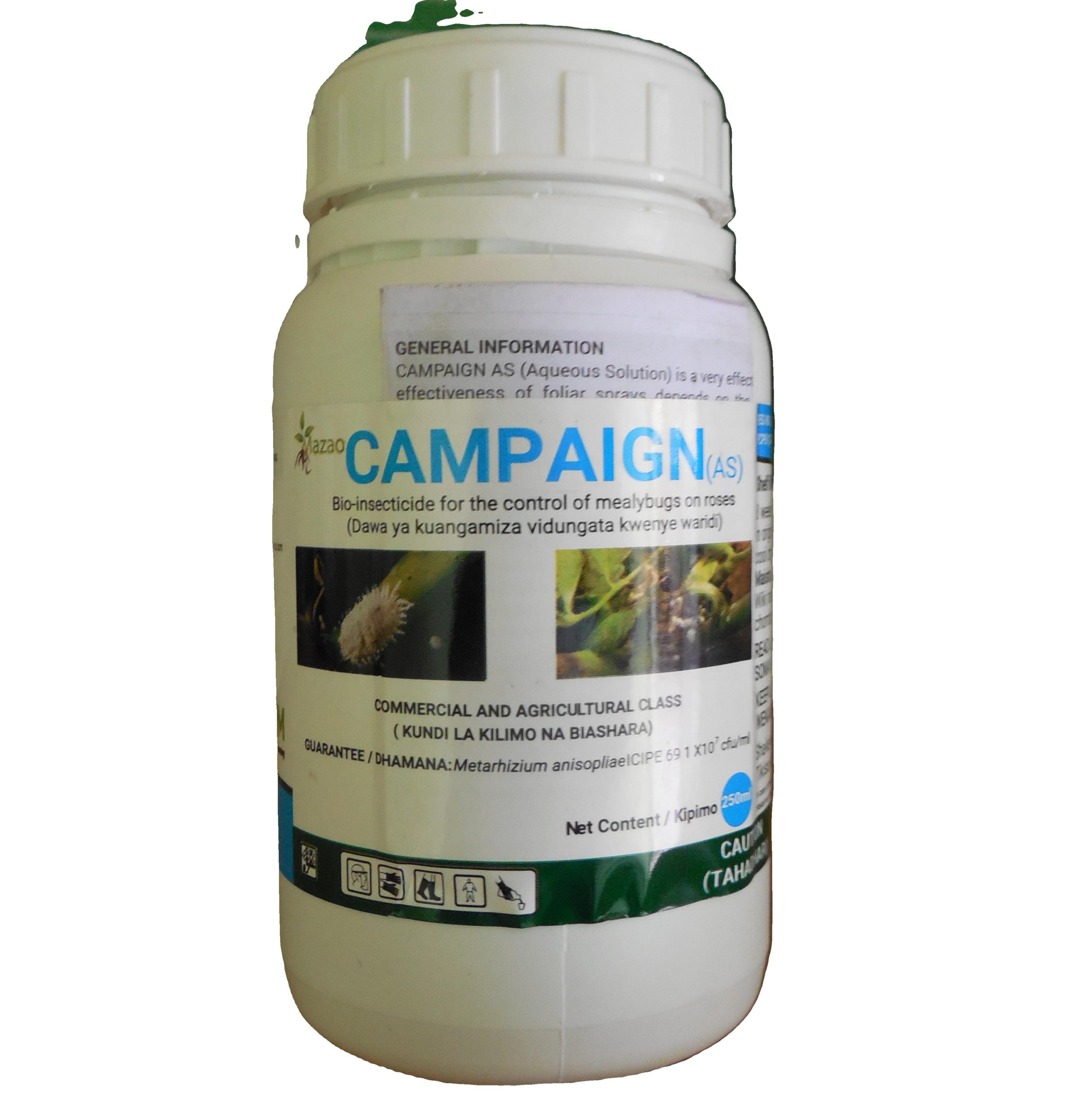 Mazao Campaign contains spores of the insect pathogenic fungus Metarhizium anisopliae strain ICIPE 69 and is used to control Whiteflies, Mealy bugs and Thrips.